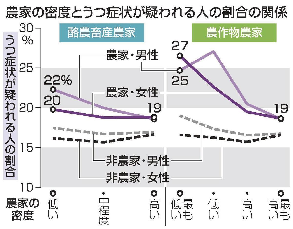 次に、住んでいる地域の農家の密度や農業の種類との関連を分析。農作物をつくる農家の場合、うつ症状が疑われる人の割合は、農家密度が「最も高い」地域で男女とも19%なのに対し「最も低い」地域では男性が25%、女性が27%に上り、酪農畜産を営む農家では農家密度が「高い」地域で男女とも19%で「低い」地域では男性が22%、女性が20%だった。