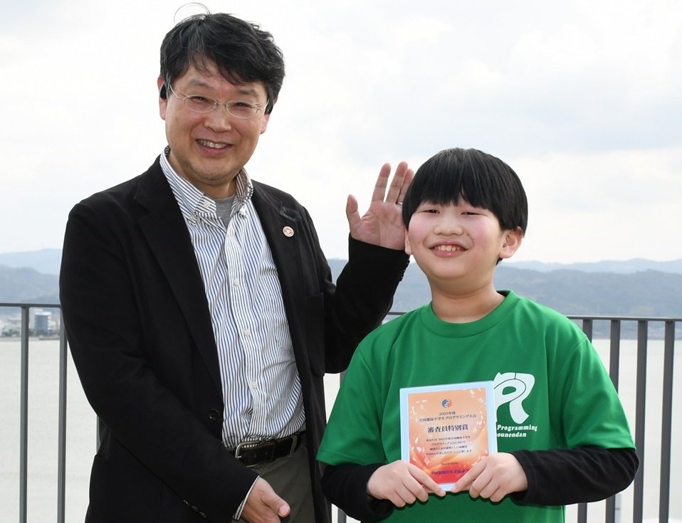 まつもとさんは、プログラミングで重要なのは、コンピューターと向き合うのではなく、人間の困りごとと向き合う姿勢とし「俵君は非常にいい感性を持っている。これからも伸ばしてほしい」とたたえた。
