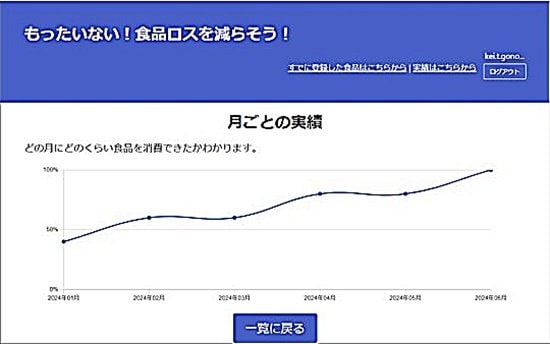 楽しく食品ロスを減らせる工夫も施した。消費した食品をリストから消去する際に「使い切った」ボタンをクリックすると「食品を消費しました! おめでとうございます!」と称賛メッセージが出るように設定。さらに月ごとの消費実績をグラフで可視化させ、達成感と次の月へのやる気を引き出せるようにした。