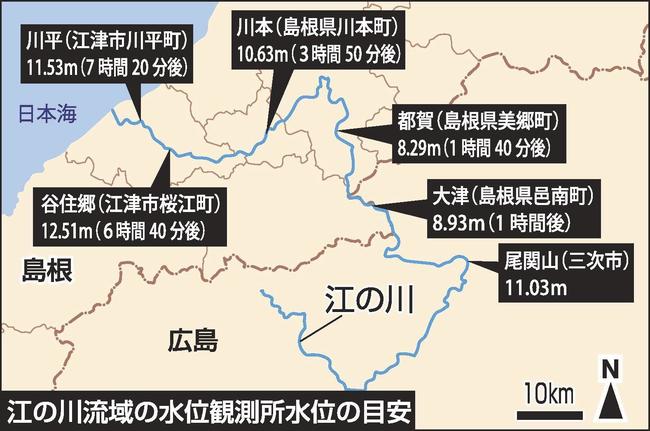 上流の尾関山観測所(広島県三次市)の水位が11・03メートルに達した場合、下流の川本(島根県川本町)では3時間50分後に10・63メートル、川平(江津市川平町)では7時間20分後に11・53メートルに上昇し、周辺地域で浸水が発生するなどとした。