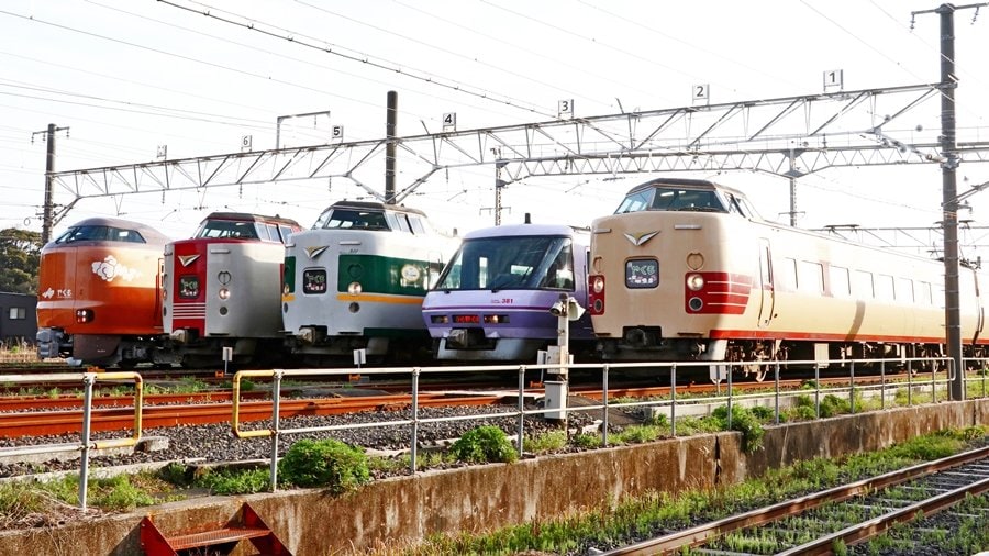 6日に投入された新型車両273系、赤と白をまとった「ゆったりやくも」、緑色を基調とした「緑やくも」、5日に運行を終えた紫色の「スーパーやくも」、鉄道ファンの人気が高い「国鉄色」の計5編成が並んだ。
