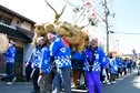 法被姿の山祭り保存会(砂川祐一会長)の男衆25人が、海辺の春日神社にある社務所で朝祝いの膳で勢いをつけ、太鼓と木やり歌に合わせて行列を組んで地区内を練り歩いた。