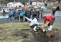 古くから林業が盛んな島根県隠岐の島町の布施地区で7日、林業の安全を祈る県指定無形民俗文化財「布施の山祭り」が営まれた。法被姿の保存会メンバーが、木やり歌に合わせて杉の巨木にかずらを巻き付ける「帯締(おびし)め」を行い、次々と斜面を転げ落ちた。