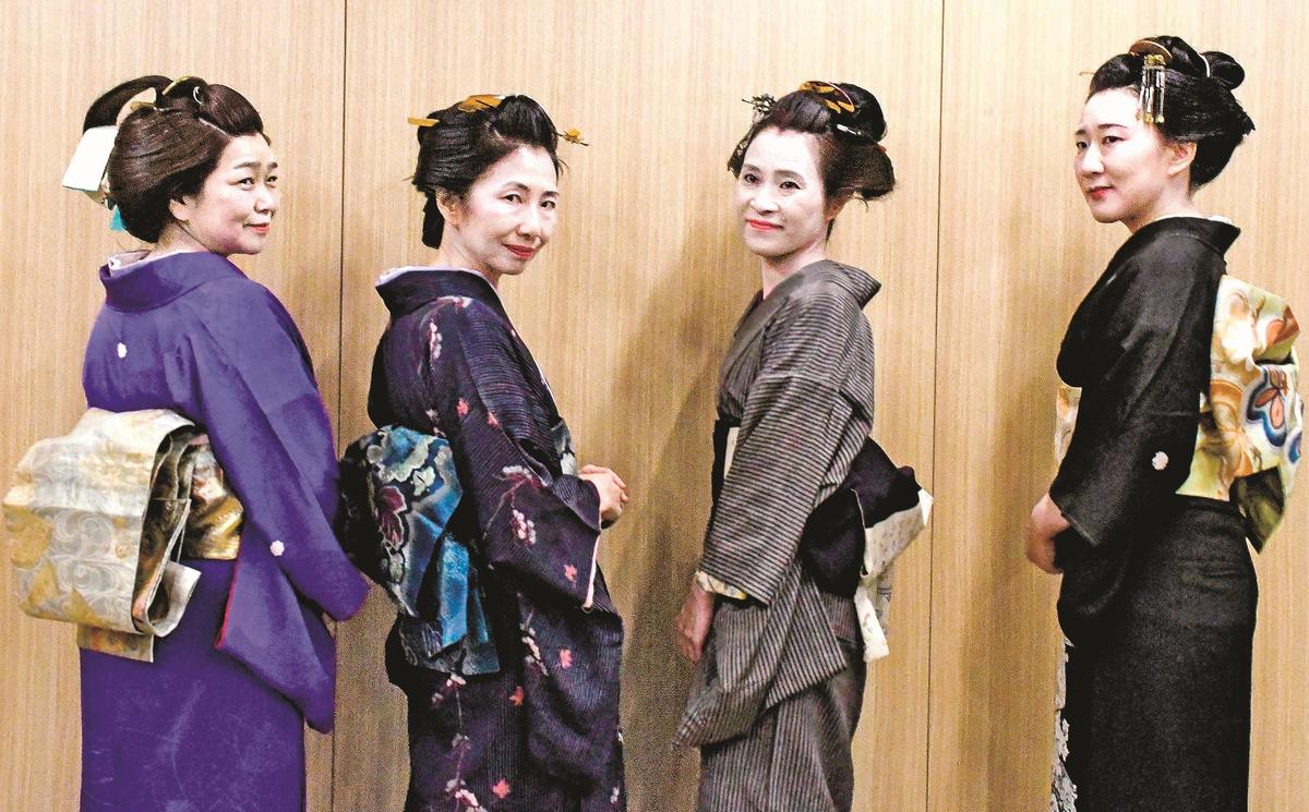 イベントでは古墳時代からの女性の代表的な結い方で髪の毛を前後に大きく結う島田髷(まげ)や江戸後期に流行した丸髷などで美しく装う。上定昭仁市長に美容師の中山ひろみさん(58)が「髪形を見ると当時の女性の流行や地位なども分かる」と説明した。