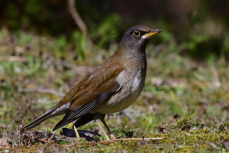 鳥がいるのは樹上だけではない。気配を感じて茂みに目をやると、落ち葉を裏返して餌を探す高さ15センチほどの鳥がいた。冬鳥のシロハラだ。人通りの多い公園にいるためか、少し近づいても逃げなかったが、素早く歩き回るため撮影に苦労した。立ち止まった瞬間を逃さずパシャリ。