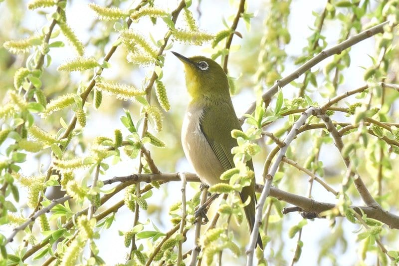 近くのヤナギに目をやると、メジロの群れが花をついばみながら「チーチー」と高い声で鳴いていた。雑食性で、ウメやサクラが咲くこの時期は甘い蜜を求めて花に集まり、その写真を撮ろうと愛好家が集まる構図ができあがる。この日も例外でなく、記者のほかに市内の男性1人がカメラを構えた。