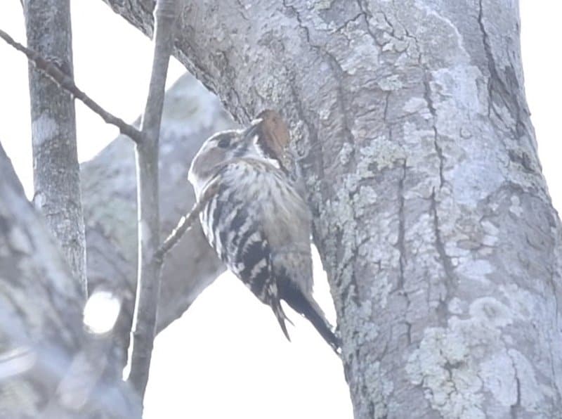 「トトトト…」とリズムよく木をたたく音でまず見つけたのが、キツツキの一種のコゲラだ。キツツキというと珍しいように感じるが、公園や街路樹で年間通じて普通に見られる。国内最少のキツツキで、スズメより少し大きい程度のかわいらしい鳥だ。