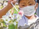二十世紀梨は自分の花粉で受粉しないため、他品種の花粉で栽培農家が手作業で受粉させる。3年生30人は校区内の栽培農家・板持浩二さん(61)=安来市久白町=の梨園を訪問。筆を使って二十世紀梨の花のめしべに花粉を付けた。