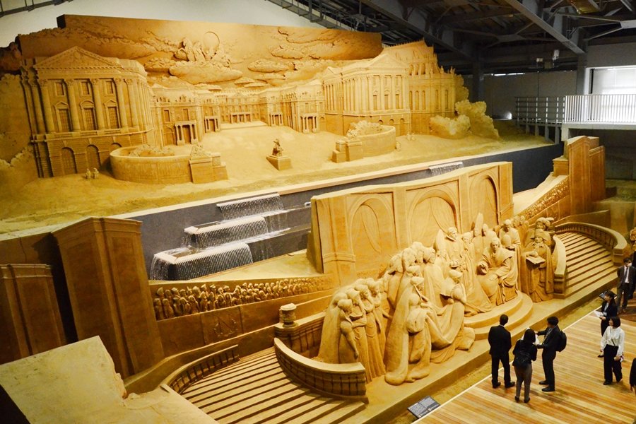 鳥取砂丘砂の美術館(鳥取市福部町湯山)の第15期展示「砂で世界旅行・フランス編」が19日開幕する。18日に内覧会があり、関係者約100人が激動の歴史や華やかな芸術文化を再現した砂像18点に見入った。