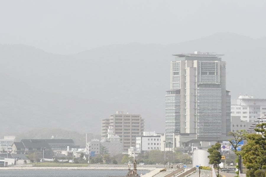 松江、鳥取両地方気象台によると、東アジア大陸からの黄砂が偏西風に流されて飛来。水平方向で見通せる距離「視程」は、午後5時時点で松江、鳥取両市で8キロとなった。