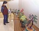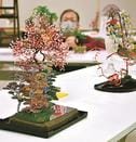ワイヤアート作家の大谷賢司さん(69)=益田市久城町=と、大谷さんが週1回開く教室の生徒3人の作品が並ぶ。0・6~1ミリの太さのワイヤを手やニッパーなどを使って曲げたり巻いたりして巧みに表現する。松の盆栽や藤の花、アジサイなどの植物を細やかに作り込み、流木を土台に仕上げたり、ハーバリウムにしたりして工夫を凝らす。