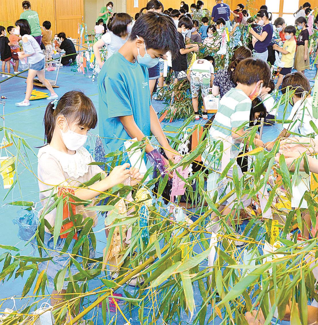子どもたちは地元住民と協力して、短冊や折り紙で作った飾りを竹に丁寧に結び付けた。短冊にはそれぞれの思いや願いを書き入れ「コロナが早くなくなりますように」と収束を祈る短冊が多く見られた。