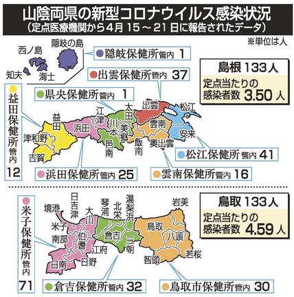 新型コロナの感染者数は両県ともに133人で、定点当たりは島根が前週比0・32人増の3・50人、鳥取が0・56人増の4・59人で、いずれも増えた。