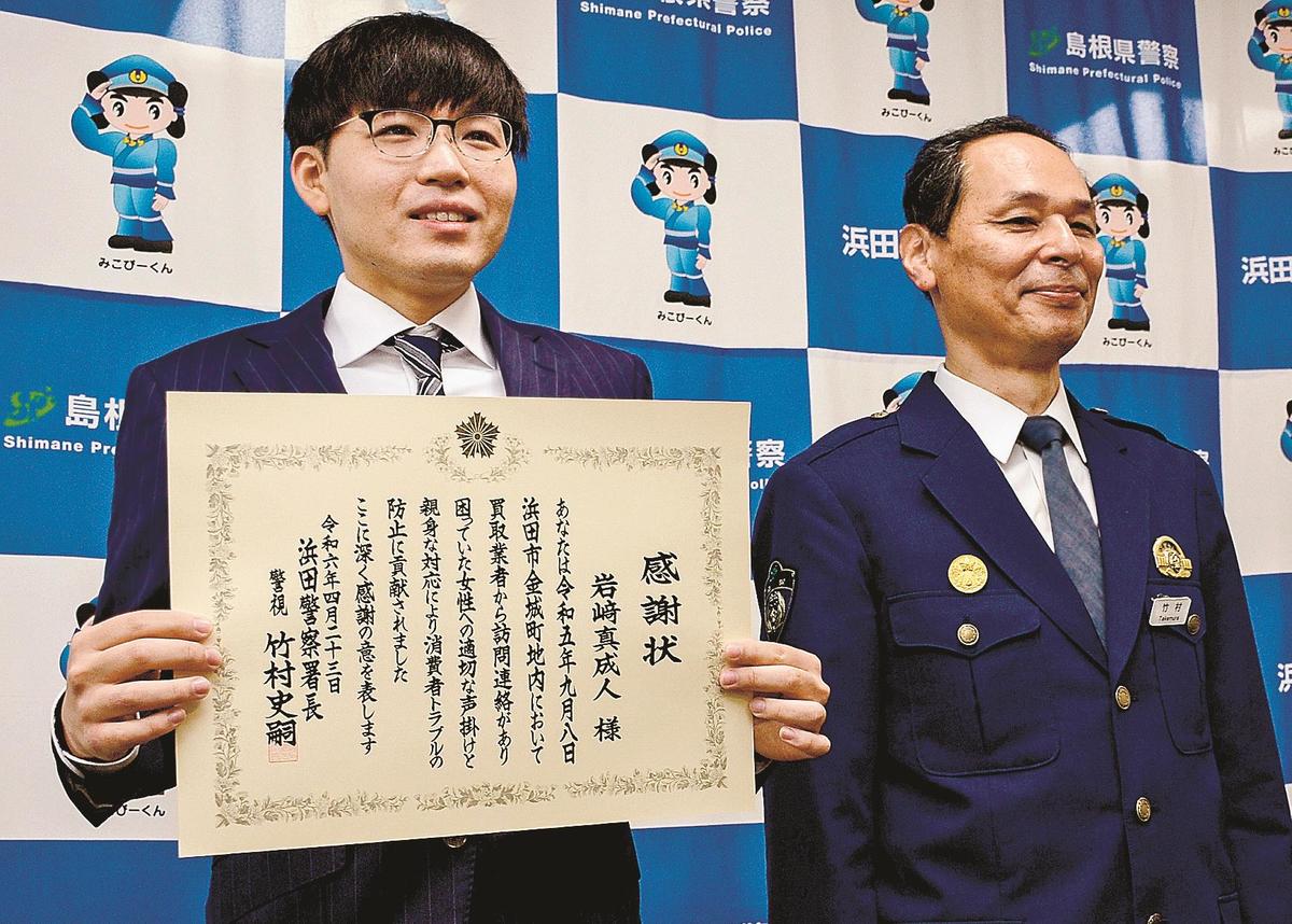 【浜田】消費者トラブルを未然に防いだとして、浜田市片庭町の薬剤師、岩崎真成人(まなと)さん(31)に23日、浜田署から感謝状が贈られた。