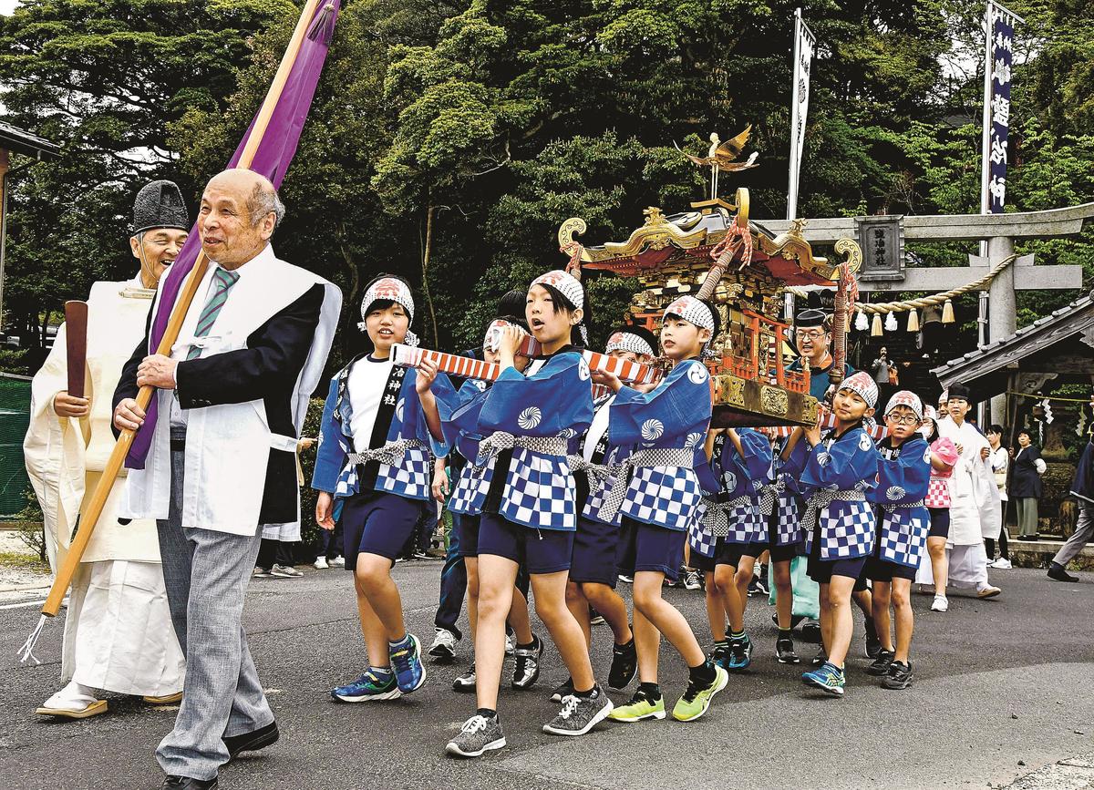 塩冶神社は家内安全をもたらすと伝わる塩冶毘古命(えんやひこのみこと)と塩冶(えんや)毘賣命(ひめのみこと)の夫婦が主祭神。毎年4月15日に例大祭があり、直後の土曜日にみこしや神楽を奉納する奉祝祭を開く。みこしは地元の塩冶小学校5年生が担い、今年は30人が参加した。