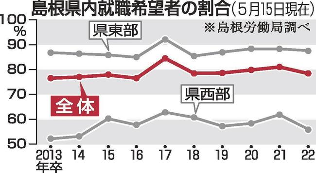 地域別で見ると、県西部は県内就職希望が56・0%(188人)となり、5・8ポイント低下した。県東部は0・7ポイント低下の87・6%(716人)で、松江は2・3ポイント上昇の87・8%、出雲は2・2ポイント上昇の93・8%となった。