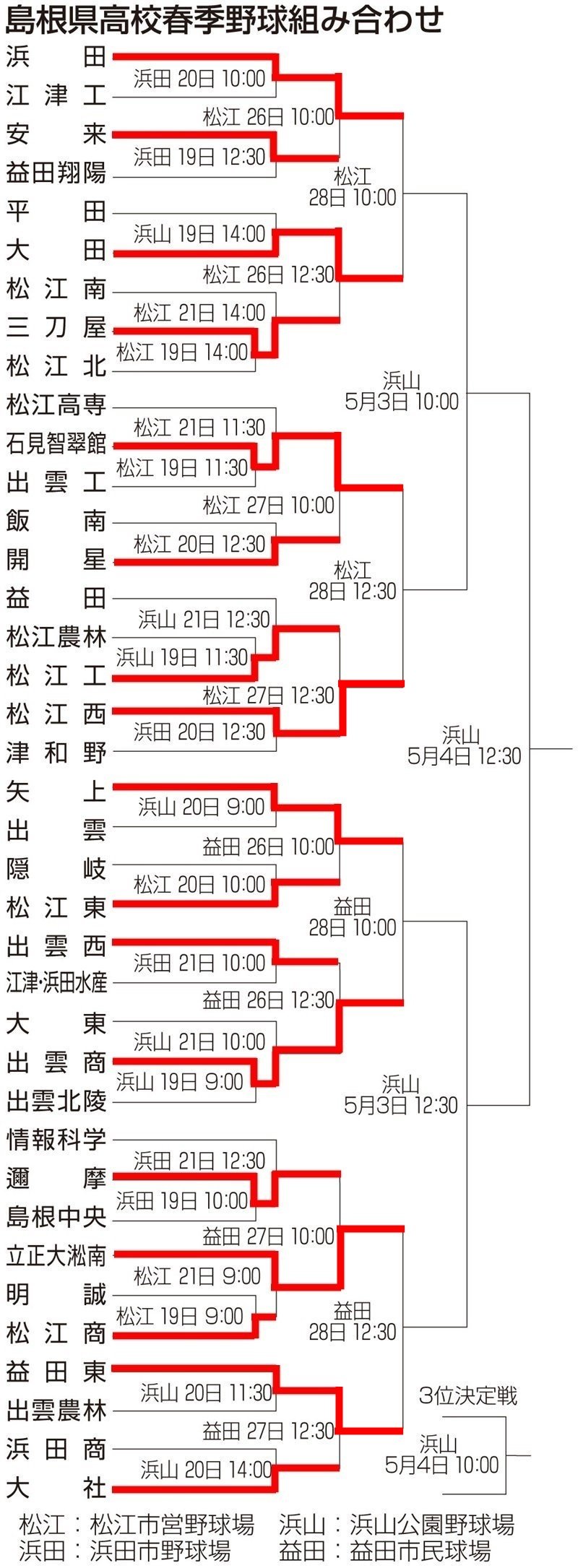 島根県高校春季野球大会は27日、松江市営野球場と益田市民球場で3回戦4試合があり、石見智翠館、立正大淞南、益田東、松江西が勝ってベスト8が出そった。23年の島根県秋季高校野球大会で3位の大社は敗退した。