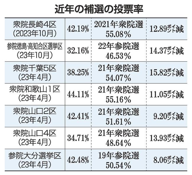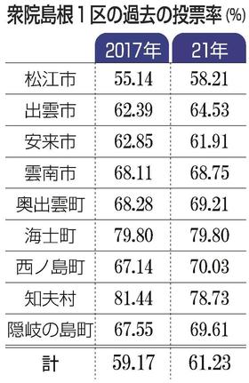 過去の島根1区の投票率は2017年衆院選59・17%、21年衆院選61・23%だった。補選は総選挙に比べて下がる傾向がある中、今回の3補選で唯一の与野党対決となった島根1区の投票率に注目が集まる。