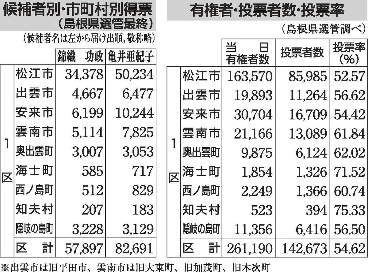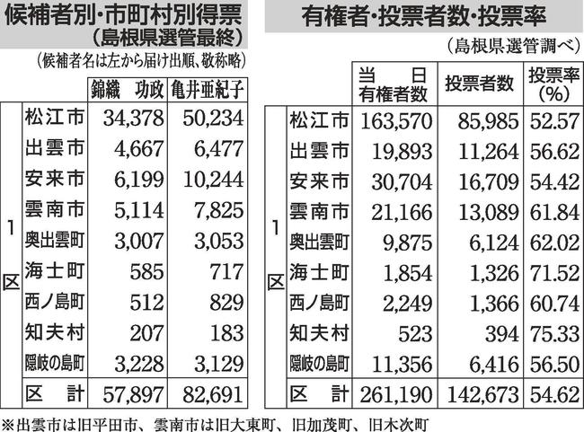島根1区の投票率は54・62%で、前回選の2021年衆院選(61・23%)比で6・61ポイント下がった。