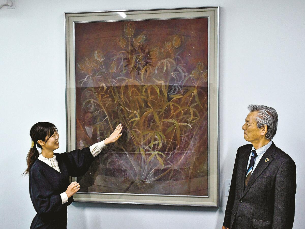 作品は、関西地方の美術系大学の代表が1人ずつ出展する展示会の代表作品にも選ばれ、京都市内で展示されているところを同校の永島一忠理事長が見つけ、話を持ちかけた。快諾した渡辺さんは「絵を見て、考える時間を持ってもらえたらうれしい」と語る。