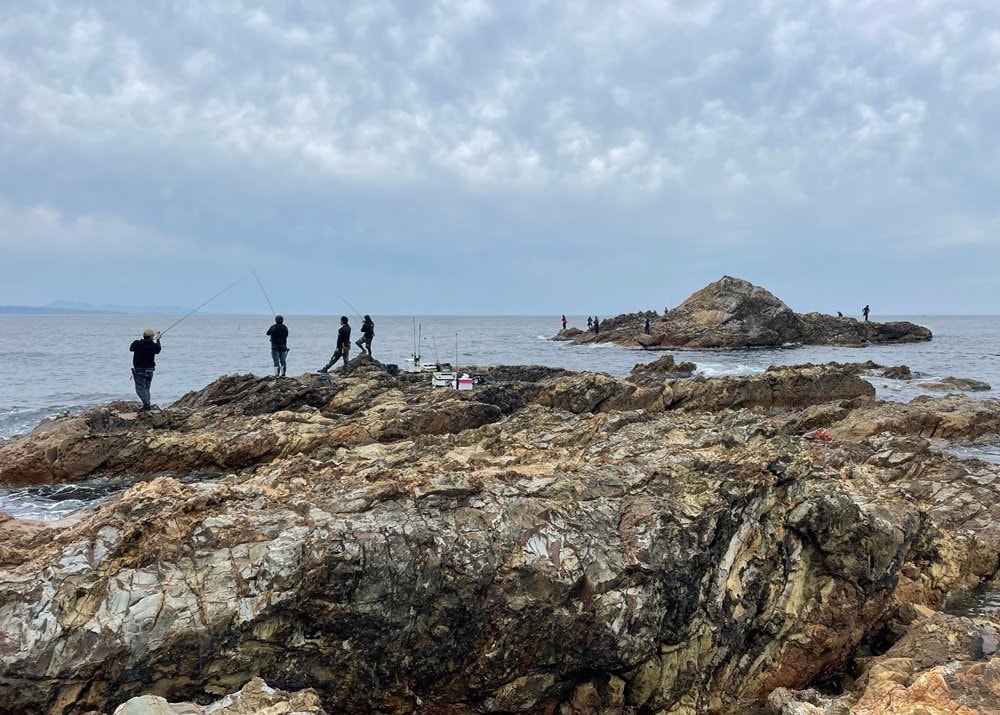 今回は初めてで場所が全く分からなかったため、スタッフに聞いて「地のかつら」という磯に上げてもらった。潮通しが良く、人気な場所という。優先権を使って磯の先端に立った3人の釣り人が次々と釣り上げる中、島の西側や南側で投げていた自分には全く反応がない。イカがいるであろう少し深くなった船道や藻場の間を探り続けたが、1時間半たっても当たりはなかった。