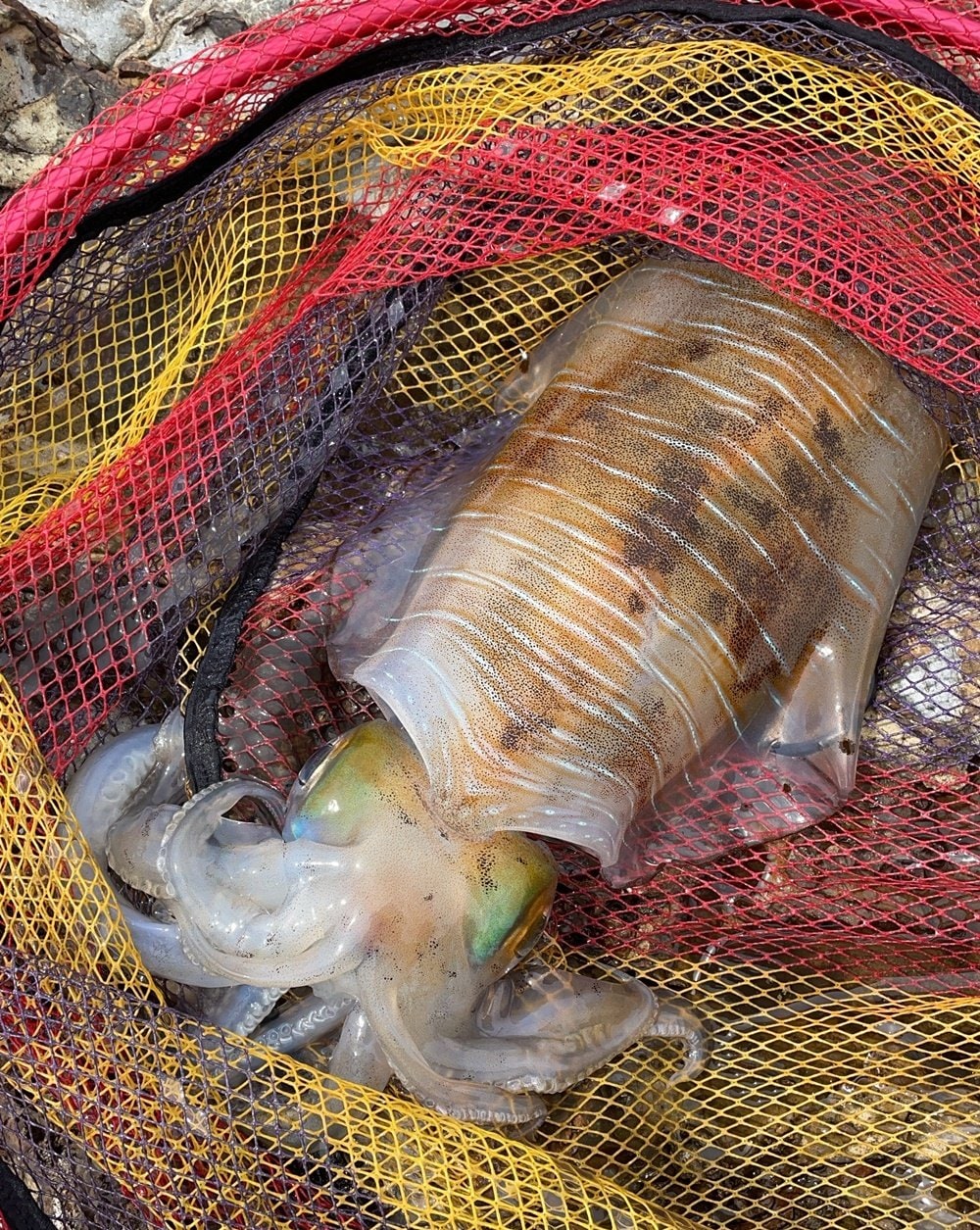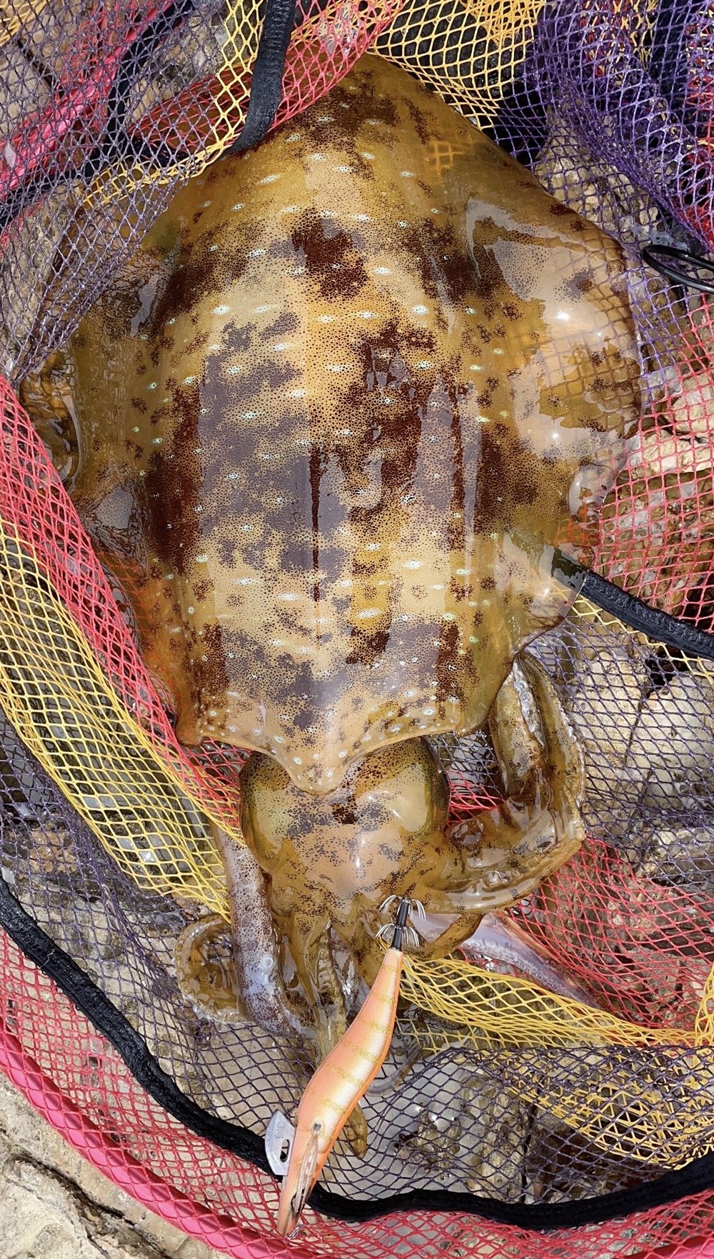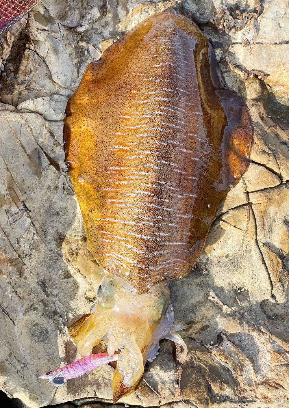 引くような感覚はなく、大きな海藻が付いているのだろうと思っていた。ただ、水面から上がってきたのはアオリイカ。しかもかなり良いサイズで計量すると1・76キロあった。恥ずかしいヒットシーンだったが、大満足だ。