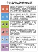 参院の合区解消など4項目の改正・追加を提案する自民党総裁の岸田文雄首相は「憲法改正は先送りできない重要な課題」と得意のフレーズを繰り出し、自らの総裁任期である9月までの実現を掲げる。とはいえ、衆院島根1区補選で党公認候補が敗れ、青息吐息の状態だ。