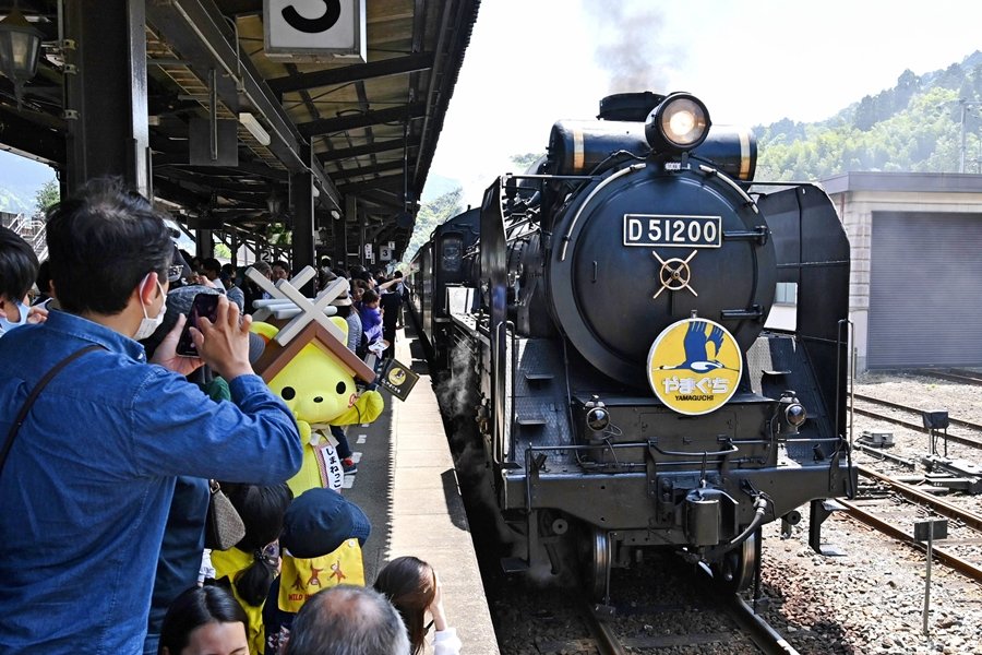 降り立った乗客はこぞってSLのヘッドマークを撮影したり、県や町のマスコットキャラクターとの記念撮影を楽しんだりした。鎌倉市の会社員、高木徳征さん(43)は「撮り鉄歴15年で、やまぐち号に乗ったのは初めて。振動と音がいい。また乗りたい」と話した。