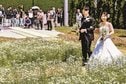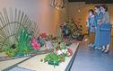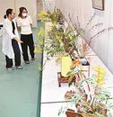 「薫風にさそわれて」をテーマに、初夏の花や新緑を使用。尾形光琳らの琳派絵画をイメージした小原流伝統の「琳派調いけばな」では、会員3人がショウブやユリ、アジサイなどを使い、色鮮やかな作品に仕上げた。新緑のカエデ、ナンジャモンジャ、カキツバタなどを使った生け花、畳1畳分のスペースで、東南アジアの山里を表現した大作も並んでいる。