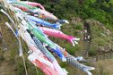 赤地に三角のうろこのこいのぼりを作った兵庫県の小学2年の門田莉音さん(7)は「模様は簡単にできて楽しかった」と話した。