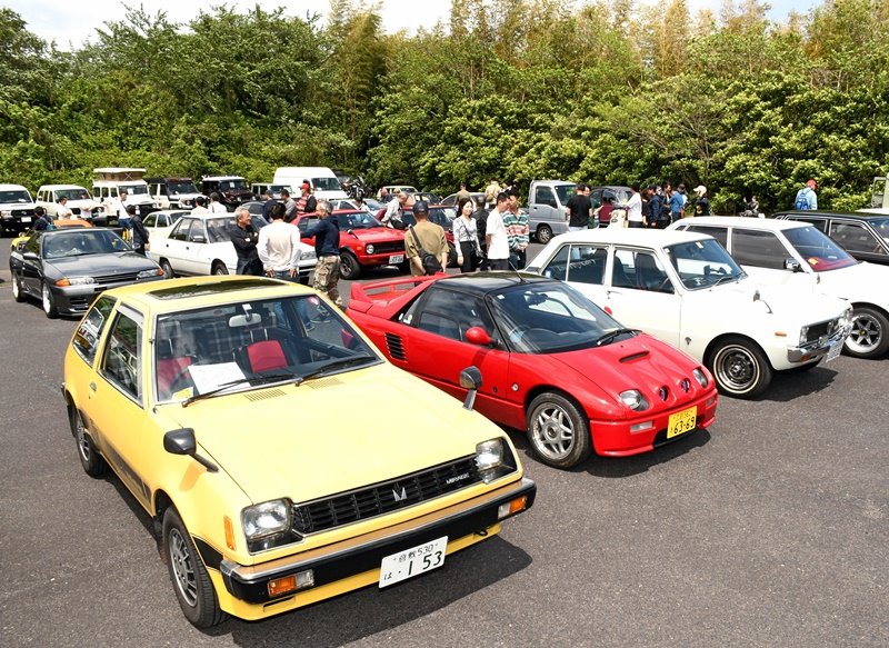 イベントは趣向性が高いものに焦点を当て、広い地域から人を呼び込もうと、住民グループ「ゆのつ組」が企画し、7回目。昭和40、50年代の車を中心に中国5県のほか東京、神奈川、大阪などの愛好家が自慢の愛車を持ち込んだ。