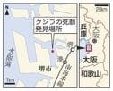 4月24日に見つかり、体長13・5メートル程度でヒゲクジラ類のニタリクジラか、それに近い種類とみられていた。2週間たち表皮が腐って剥がれ、黄色い脂肪が露出した状態。岩場に漂着していたがその後、波で船着き場近くに移動していた。