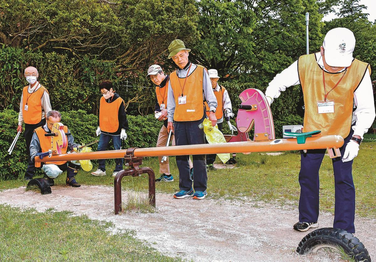 【大田】民生委員・児童委員の日(12日)を前に、大田市の大田町民生児童委員協議会が7日、町内の各公園で遊具の整備点検や環境美化に取り組んだ。