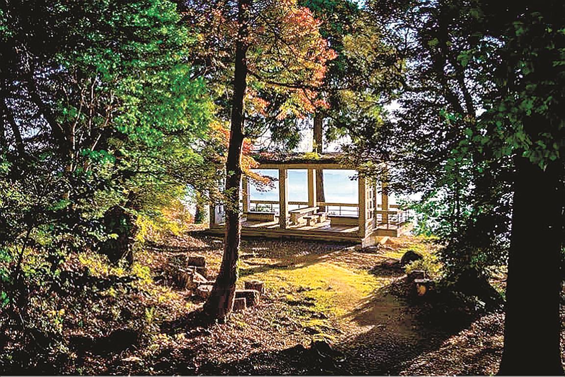 最優秀作は、松江市枕木町の枕木山にある華蔵寺の展望台を、2020年11月中旬に撮影。木漏れ日に包まれた建物と、奥に広がる中海や大山の風景に期待感を抱かせる構図で切り取った。