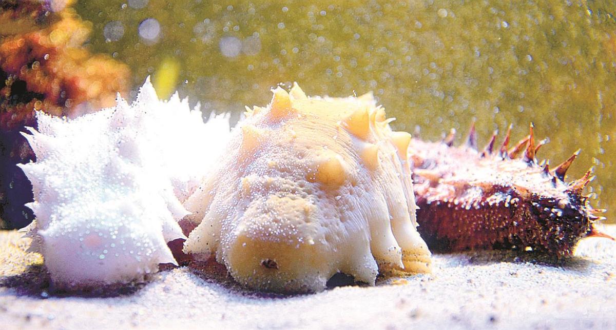 ナマコは、ウニやヒトデが属する「棘皮(きょくひ)動物」の仲間。体色は生息エリアによって違いがあり、外洋の岩礁や砂帯では赤褐色、内湾では青緑色になるという。まれに白色は見つかるものの、黄色は珍しい。