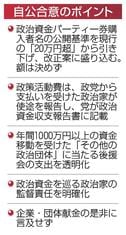 根拠不明の提案を自民が行った事情は想像が付く。公開の範囲が広がりすぎると、企業などによるパーティー券の買い渋りを招き、これまでのように資金集めができなくなると懸念したからだ。結局、与党案は「20万円超から引き下げ、改正案に盛り込む」とだけ記し、新たな基準額の設定は改正案作成まで先送りした。