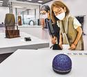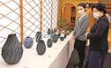 個展では築窯初期に制作していた備前焼や志野焼のほか、和風の幾何学模様をつけた作品が並ぶ。