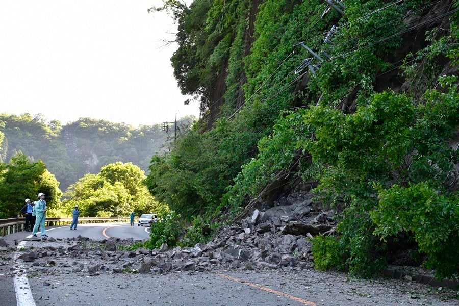 同事務所によると、高さ約15メートル、幅約10メートルにわたって斜面が崩落。土砂や岩が落石防止の防護網を破り、片側1車線の道路の上下線とも幅約10メートルにわたってふさいだ。