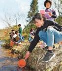 城納陽真莉(ひまり)ちゃん(5)は「アユを触ったらつるつるしていた。かわいかった」と話した。因原支部の堂面和正支部長(75)は「放流体験を通じて、古里に愛着を持ってもらいたい」と願った。(佐伯学)