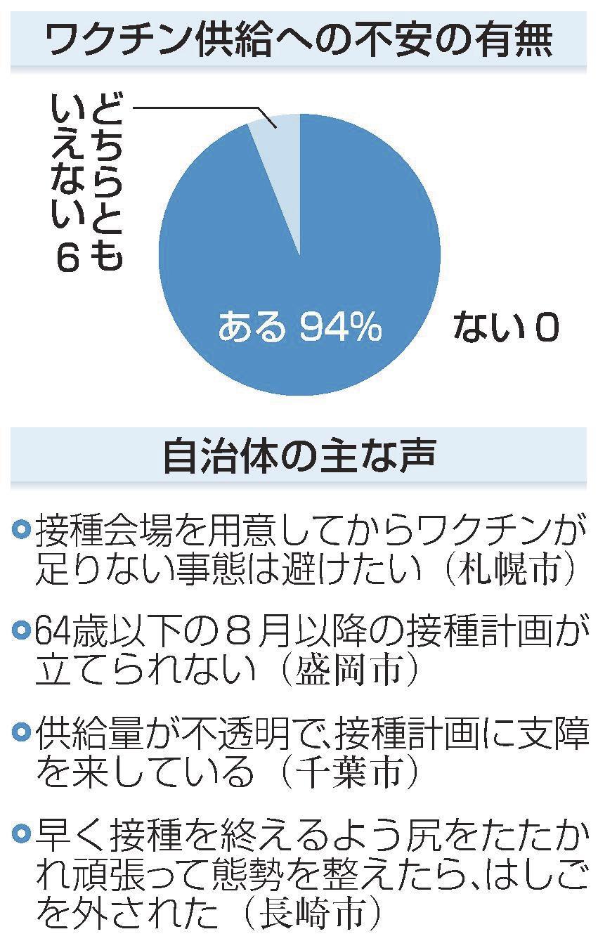 64歳以下を対象とした新型コロナウイルスワクチンの一般接種で、都道府県庁がある47市区の94%に当たる44市区が、国からのワクチン供給に不安を感じていることが3日、共同通信の調査で分かった。一般接種の開始時期は6~7月が94%(44市区)に上る。しかし「接種計画に支障を来している」(千葉市)など、国に供給スケジュールの提示を求める声が相次いだ。