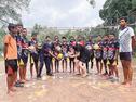 赤や桃色のチューリップや青いザリガニといった動植物を題材にした作品の輪郭が太い線で描かれ存在感を放つ。出身地・美保関町の港内を題材にした作品も目を引く。