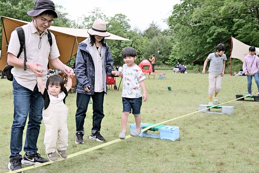 訪れた子どもたちは、芝生広場でベルトの上を綱渡りをするように歩く「スラックライン」や、木の棒を投げてピンを倒す「モルック」を体験。バルーンショーでは、ピエロが風船を使って動物や花を作るパフォーマンスに見入った。