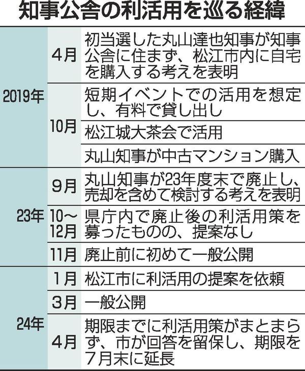 県庁内で案が出ず、市に提案を求めた立場の丸山知事は、今月9日の定例会見で「象徴的な場所で活用しようとなれば安い金額ではない。(市の中で)検討する時間も必要だろう」と述べ、改めて市の返答を待つ姿勢を示した。市は現在、松江商工会議所に呼びかけるなどして検討しており、松浦徹理事は「一度回答を保留している。(7月末までに)市としての案は用意する」と説明する。
