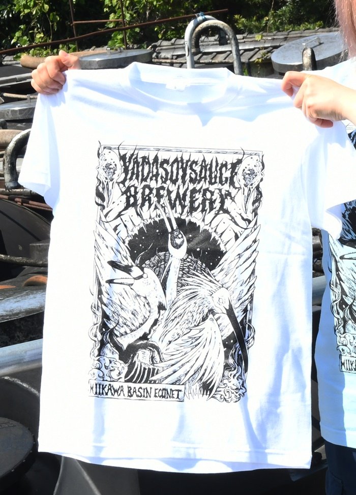 水鳥のTシャツは、大型水鳥が生息できる斐伊川水系の自然環境と水資源の豊かさこそ、しょうゆやみそ作りにも必要という考えで制作。公益財団法人・日本生態系協会(東京都)が協力した。