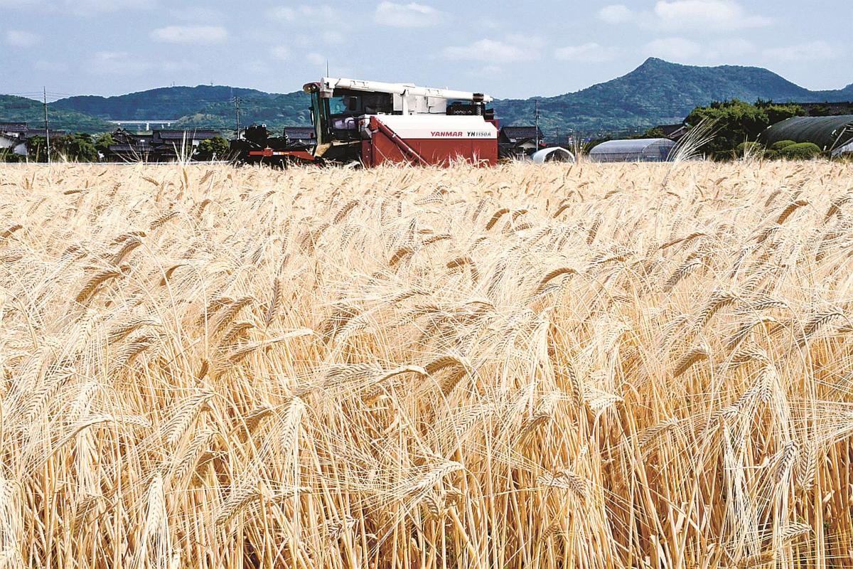 麦の収穫期「麦秋」を迎えた。島根県内最大の産地・出雲市斐川町では、太陽の光を浴びて黄金色に輝く穂が畑一面に広がり、刈り取り作業がピークを迎えている。