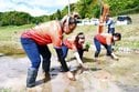 地元の農事組合法人「橋波アグリサンシャイン」(大谷健二組合長)の会員が所有する約2アールの水田に入り、水面のカエルに歓声を上げたり、ぬかるんだ泥に足を取られ尻もちをついたりしながら、もち米のヤシロモチの苗を30センチ間隔で丁寧に植えた。