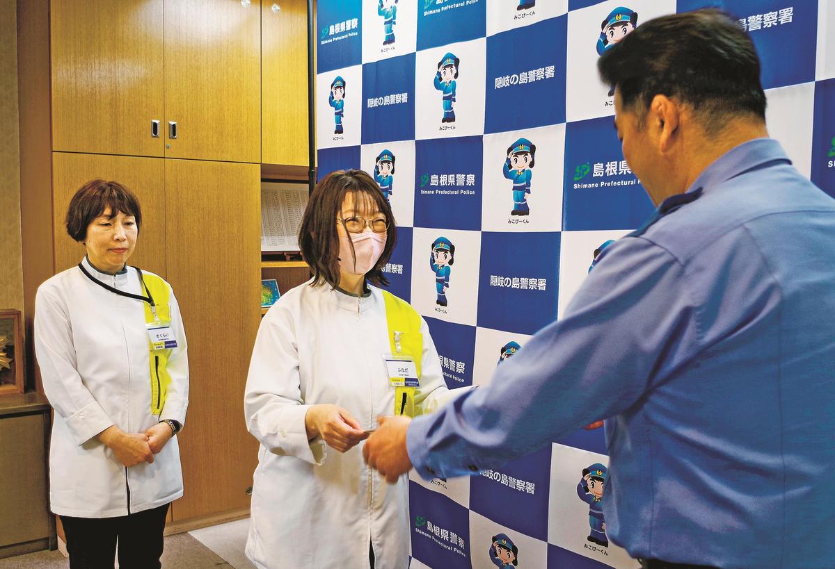 感謝状を受けたのは隠岐の島町城北町、薬マツモトキヨシサンテラス店の船田明美さん(53)と桜井勝美さん(53)。2人は4月25日、60代の女性客から「4万円分の電子マネーカードが欲しい」と尋ねられた。高齢者が高額なカードを求めるのに違和感を抱き、同署がカードを扱う店舗に配布する特殊詐欺防止のチェックシートを女性に示した。
