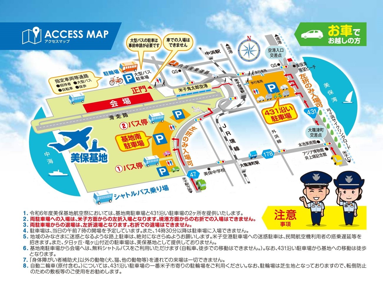 ・駐車場は、基地南と国道431沿いの2カ所。開場はいずれも26日午前7時で、午後2時半以降は駐車場に入場できない。米子空港駐車場の利用は不可で、夕日ヶ丘・竜ヶ山付近の駐車場は美保基地として提供していない。