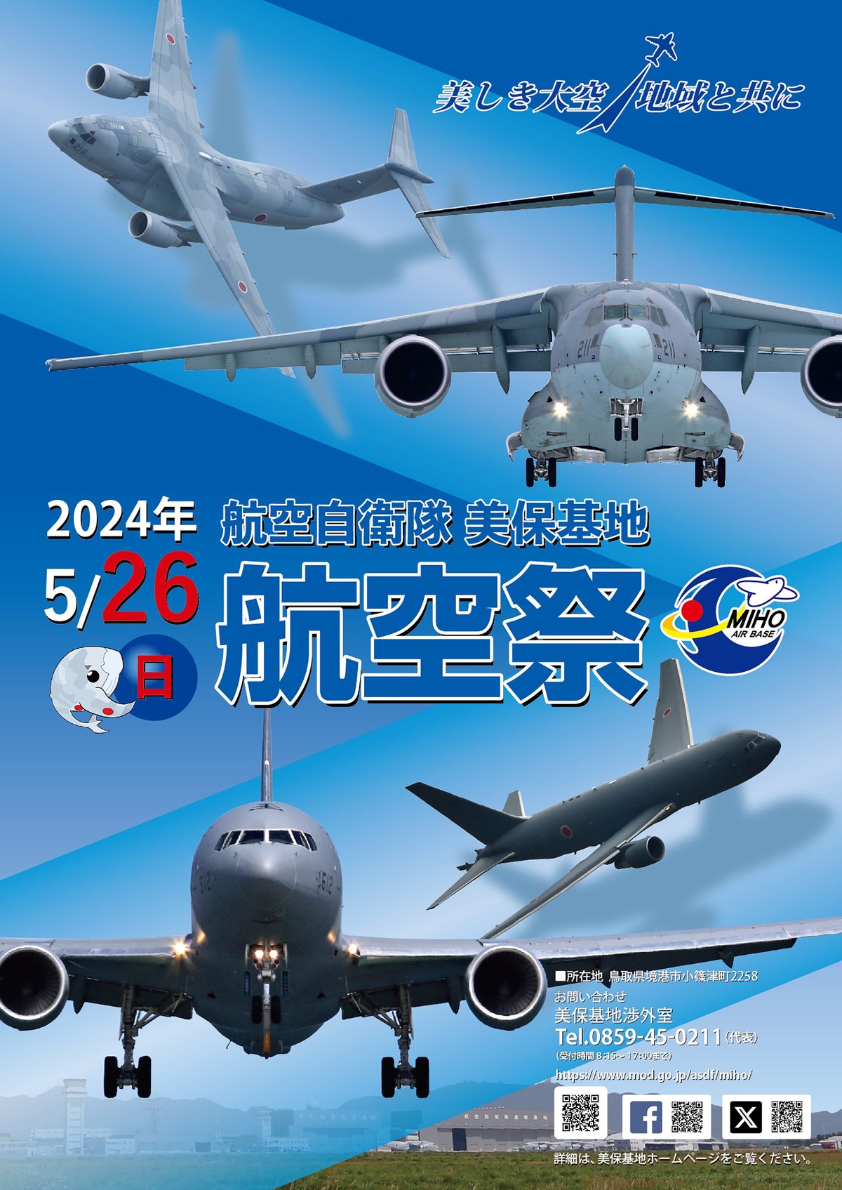 航空自衛隊美保基地(境港市小篠津町)で26日午前9時~午後3時、航空祭が開かれる。美保基地所属の輸送機C2や空中給油・輸送機KC46Aなどが上空を飛行。地上では陸海を含む自衛隊の航空機などが展示されるほか、物販もある。
