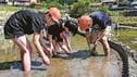 島根県奥出雲町三所で26日、田んぼの生き物観察会があった。家族連れが網でカエルやゲンゴロウなどを捕り、多様な生き物が生息する豊かな自然について学んだ。